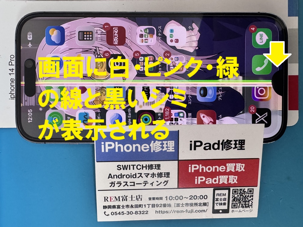 ガラスは割れていませんが、落として画面に白・ピンク・緑色に光る線と黒いシミが表示される状態でしたので、画面の交換を即日修理で対応させていただきました。