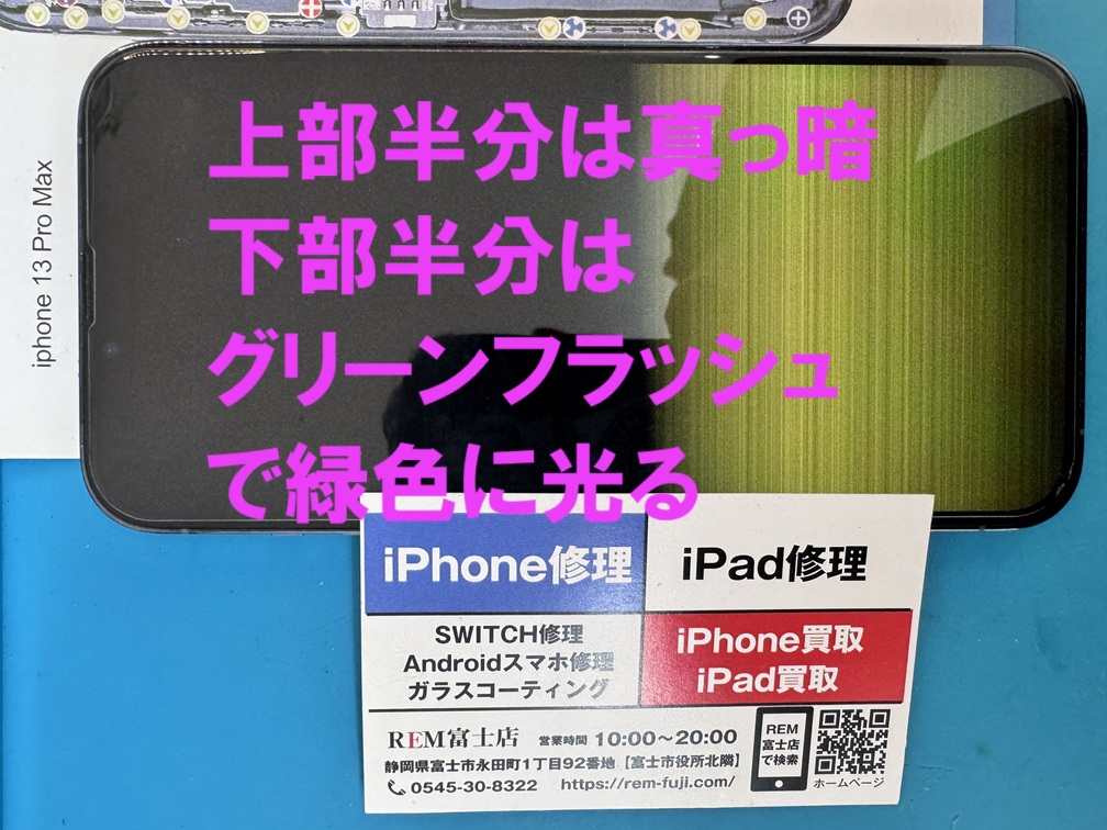 ガラスは割れていませんが、画面上部の半分が真っ暗で映らない、下部半分はグリーンフラッシュで緑色に光る状態でしたので、画面の交換を即日修理で対応させていただきました。