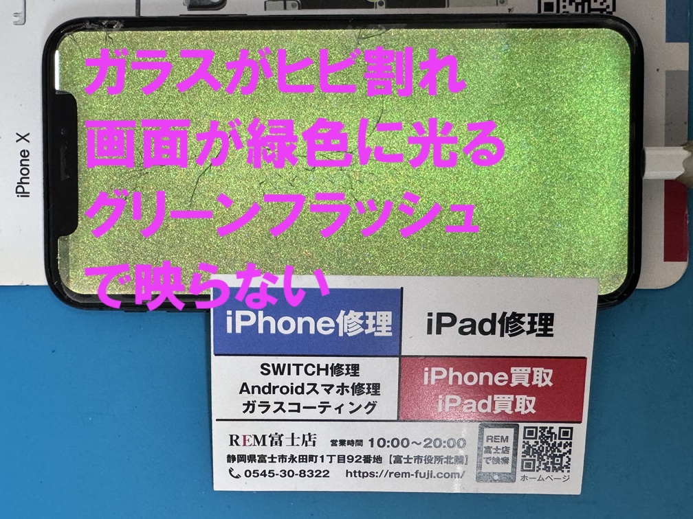 落としてガラスがヒビ割れ、有機ELパネルが壊れグリーンフラッシュで緑色に光り画面が映らない状態でしたので、画面の交換を即日修理で対応させていただきました。