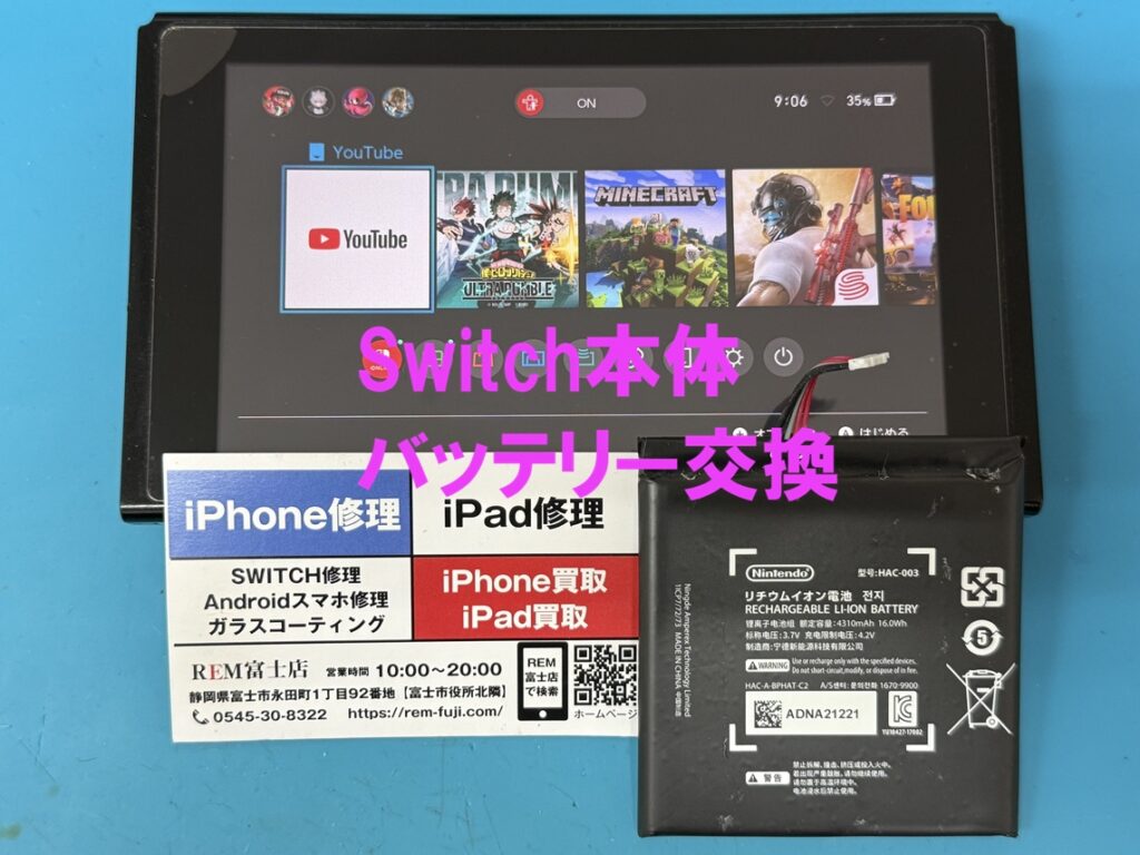 REM(アールイーモバイル)富士店では、Switchのタッチパネル破損、液晶パネルが映らない、バッテリー交換、充電できない、Joy-Conのアナログスティックが勝手に動く、電源が入らないなど幅広い修理に対応いたします。
