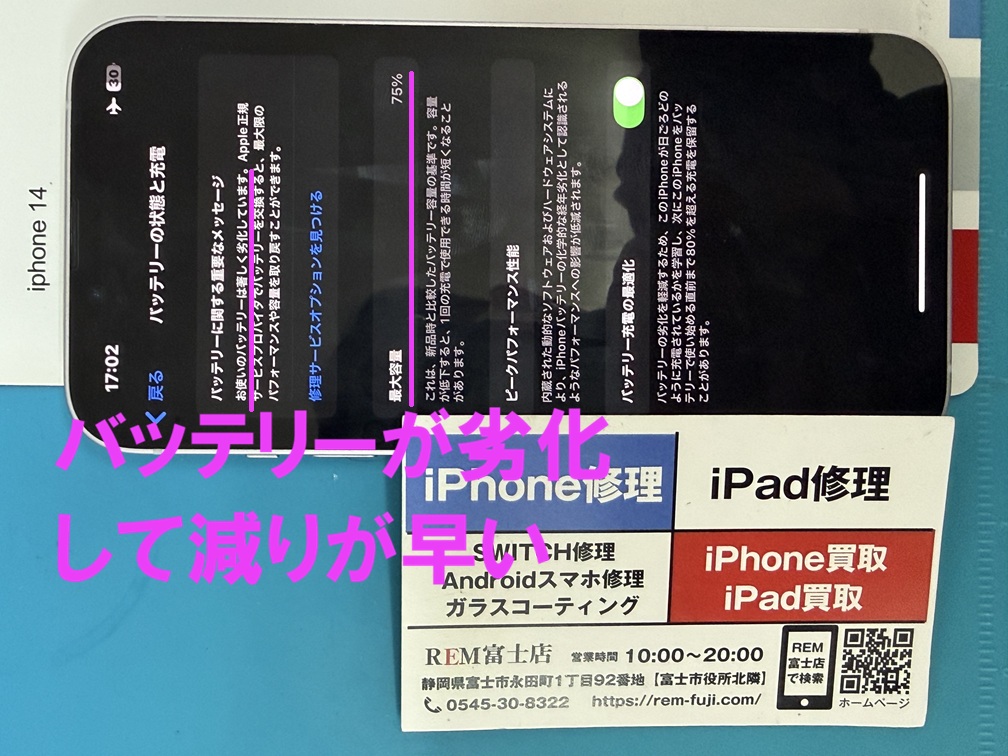 設定→バッテリー→バッテリーの状態で確認すると、最大容量が80%以下で、減りが早い状態でしたので、大容量バッテリーに交換を即日修理で対応させていただきました。