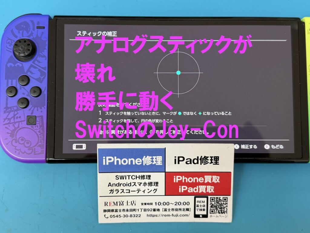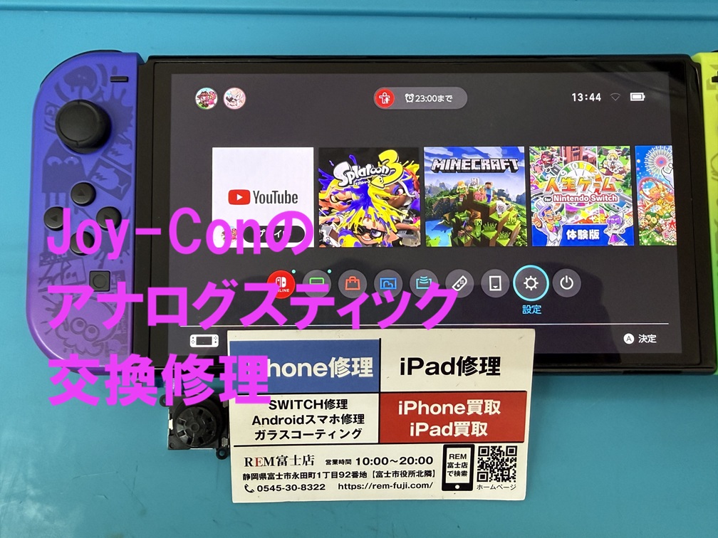 REM(アールイーモバイル)富士店では、Switchのタッチパネル破損、液晶パネルが映らない、バッテリー交換、充電できない、Joy-Conのアナログスティックが勝手に動く、電源が入らないなど幅広い修理に対応いたします。