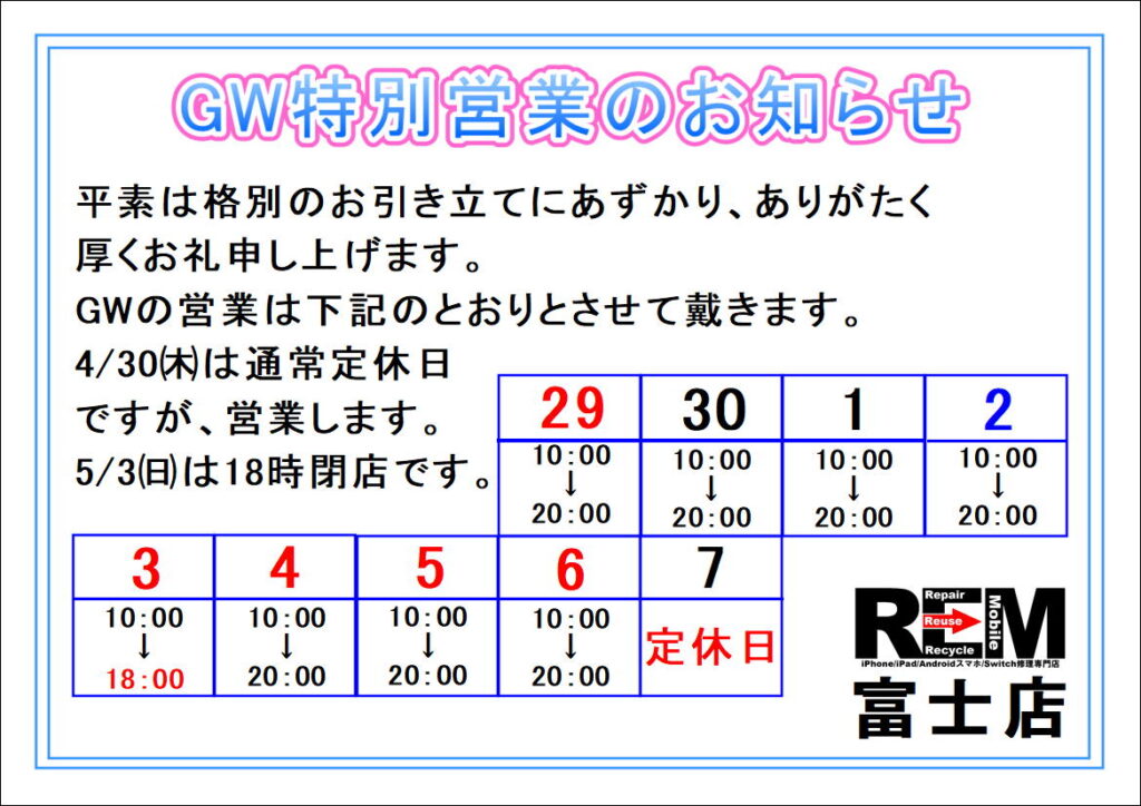 GW期間中の営業時間のご案内です。4/30㈭は休まず通常営業致します。