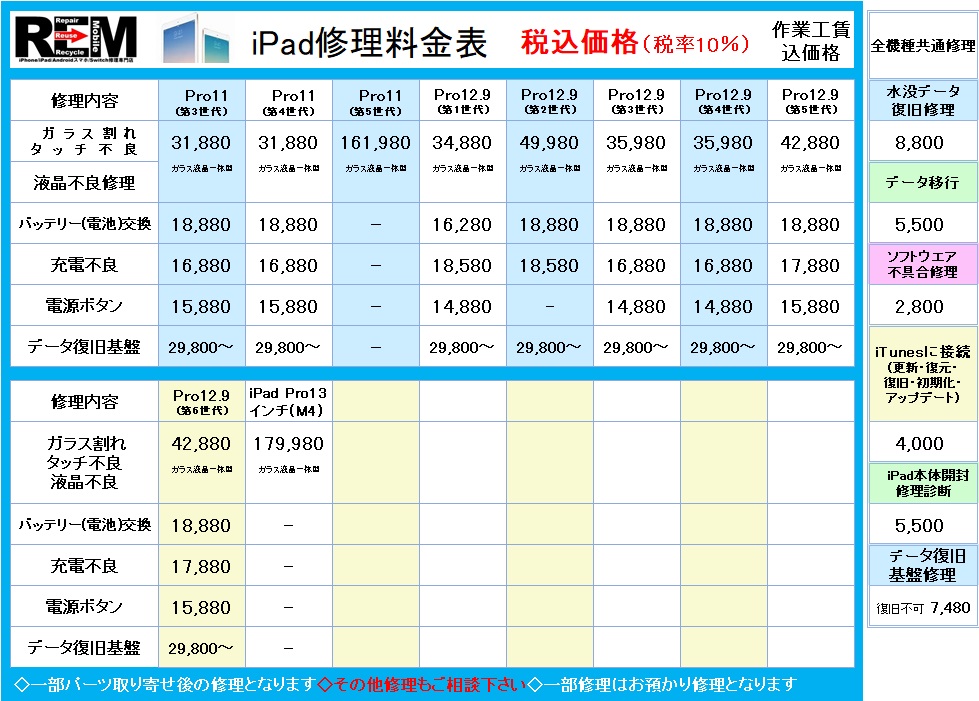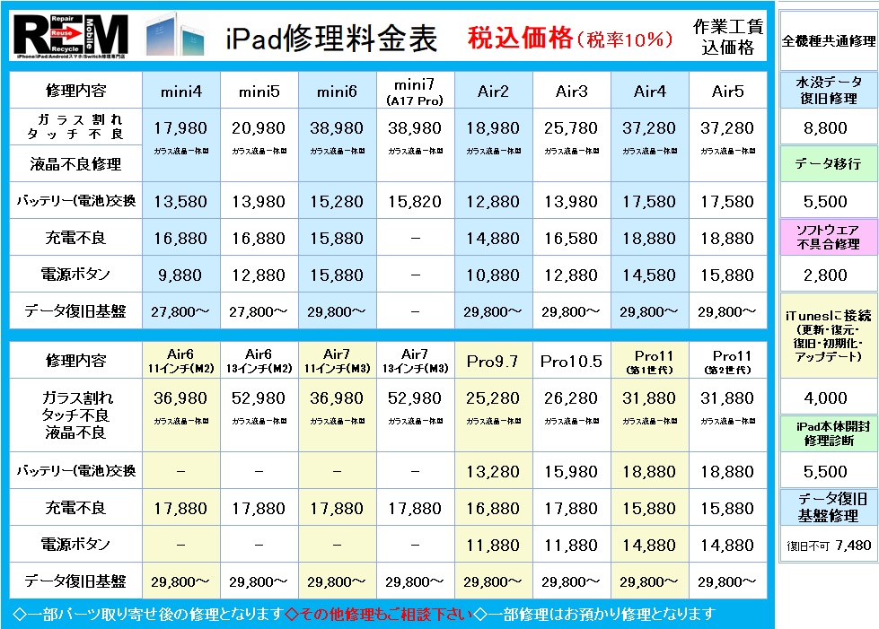 【iPad/iPodが壊れた⇨どういった修理になるの??】 ◇ガラス割れ・タッチ不良修理◇ 画面のガラスが割れた、タッチ操作ができない、画面に触れていないのに勝手に動く等の修理になります。 ◇液晶不良修理◇ 画面が映らない、画面が暗い、画面の色がおかしい、画面が浮いてきた(バッテリー膨張の場合もございます)、画面に縦線や横線が入っている等の修理になります。 ◇バッテリー(電池)交換修理◇ バッテリーの寿命ですぐに減ってしまう、充電ができない(コネクタ故障の場合もございます)、画面が浮いてきた(バッテリー膨張)、端末が熱くなる、残量が0%になる前に勝手に電源が落ちてしまう等の修理になります。 ◇充電不良修理◇ 充電ケーブルを挿しても充電されない(バッテリー不良の場合もございます)、PCと接続(同期)できない等の修理になります。 ◇イヤホンジャック不良修理◇ イヤホンを挿しても音が聞こえない、イヤホンの片方からしか聞こえない、イヤホンが挿せない、音が途切れる 等の修理になります。 ◇フロントカメラ(インカメラ)修理◇ カメラが起動しない、ピントが合わない、光やスジなどが入る等の修理になります。 ◇リヤカメラ(アウトカメラ/背面カメラ)修理◇ カメラが起動しない、ピントが合わない、光やスジが入る等の修理になります。 ◇外部スピーカー修理◇ スピーカーから音が出ない、片方のスピーカーから音が出ない等の修理になります。 ◇電源ボタン不良修理◇ スリープボタン(電源ボタン)を押しても反応しない、ボタンが陥没して反応しない等の修理になります。 ◇ボリュームボタン修理◇ ボリュームボタン(音量)を押しても反応しない、ボタンが陥没して戻らない等の修理になります。 ◇ホームボタン不良修理◇ ホームボタンが反応しない、ボタンが割れた、ボタンが陥没して戻らない等の修理になります。 ※指紋認証が備わった機種については指紋認証機能が使用できなくなる場合がありますので、ご相談ください。 ◇水没データ復旧修理◇ 濡れてしまい動かなくなったiPadを、データ(バックアップ)が取れる状態に復旧する修理になります。 ※基盤以外のパーツの取替が必要の場合は別途修理料金が掛かります ◇iTunesに接続◇ 「iPadは使用できません」の状態からの復旧、リカバリーモードからの復旧、更新による最新iOSバージョンへの書き換え、パスコードロックからの復旧、iOSソフトウエアの不具合による更新・復旧作業等の修理になります。 ◇データ初期化◇ 内部データの初期化修理になります。 ※Apple ID、パスワードが必要となる場合がございます ◇データ移行◇ 機種変更時にiPad内部のデータ(連絡先・写真・アプリ情報)を別のiPadに移行 ※LINE・Facebook・Instagram・ゲーム等のアプリの再ログインについてはお客様ご自身にて行っていただきます ◇データ復旧基盤修理◇ 水没や激しい落下等による基盤損傷により動かなくなったiPadの基盤そのものを修理しデータ復旧する修理になります。 ※他店で修理不可能、基盤修理が必要とされた端末の修理も受付しております ※データ復旧を最重要目的とした修理となります